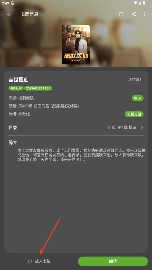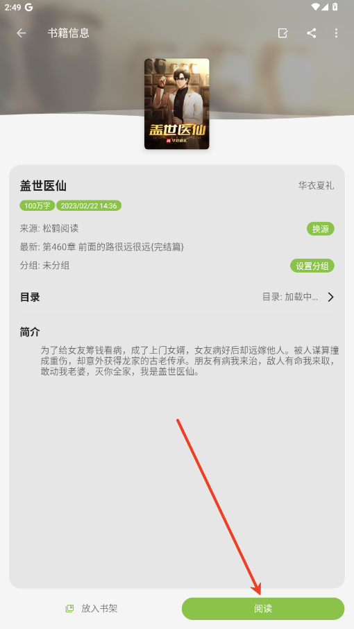 点击选中的小说进入详情页,点击“阅读”按钮开始阅读。您还可以查看章节目录,选择想看的章节。