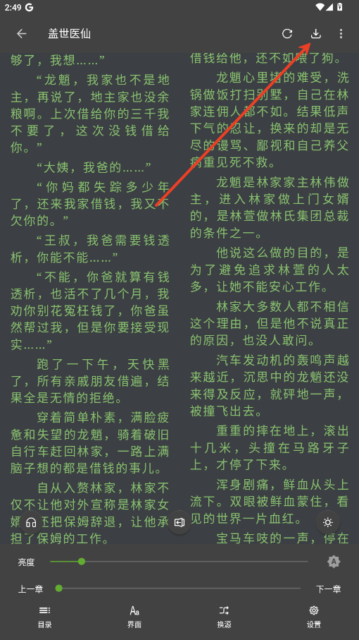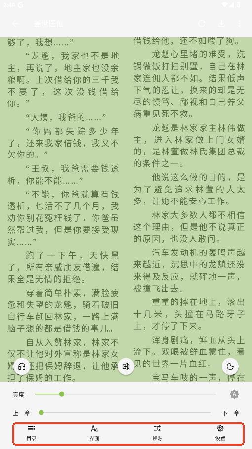 1.进入小说阅读界面,打开菜单栏。点击亮度右侧的A按钮。