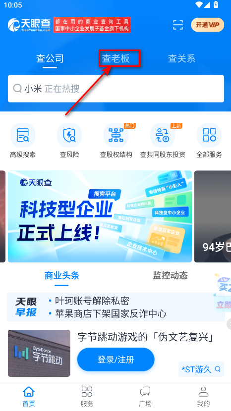 1.我们来到天眼查app首页,点击查老板