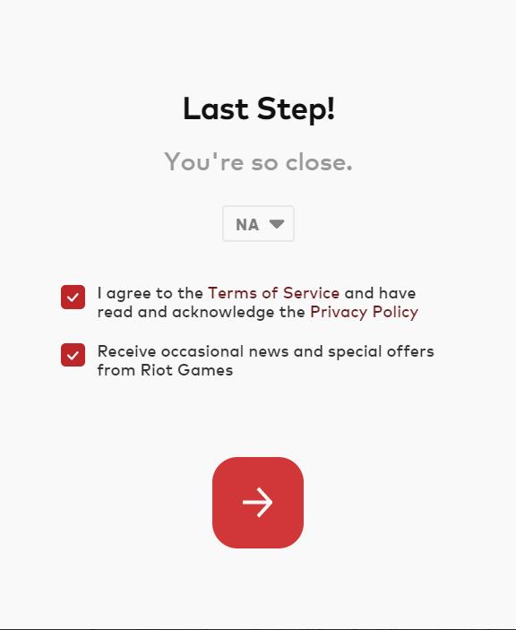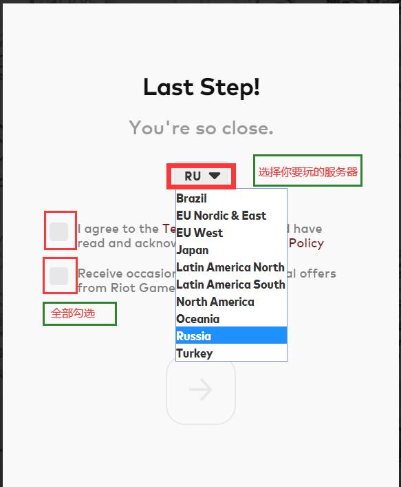 8.首先选择您要玩的服务器(RU俄服 JP日服 NA美服 EUW西欧服 BR巴西服 TR土耳其服等),勾选LOR官方协议,继续下一步;进入到注册结果页面。即完成注册了。