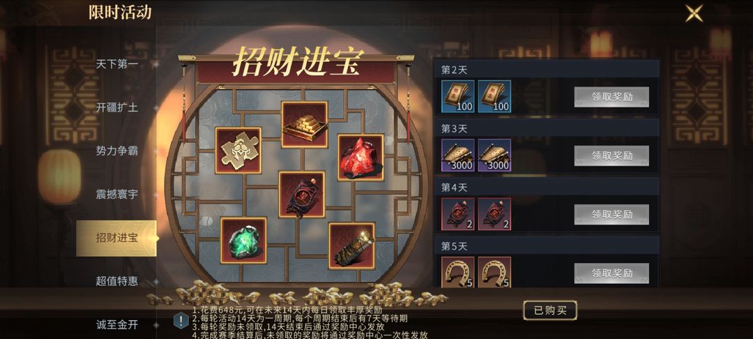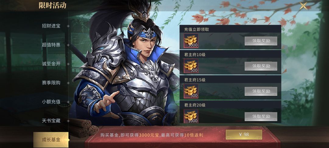 限时活动一赛季聚宝盆必买,实惠后面就没有了。小额充值,划算,除了领红将碎片和元宝外,还有可能中奖,看运气。成长基金必买