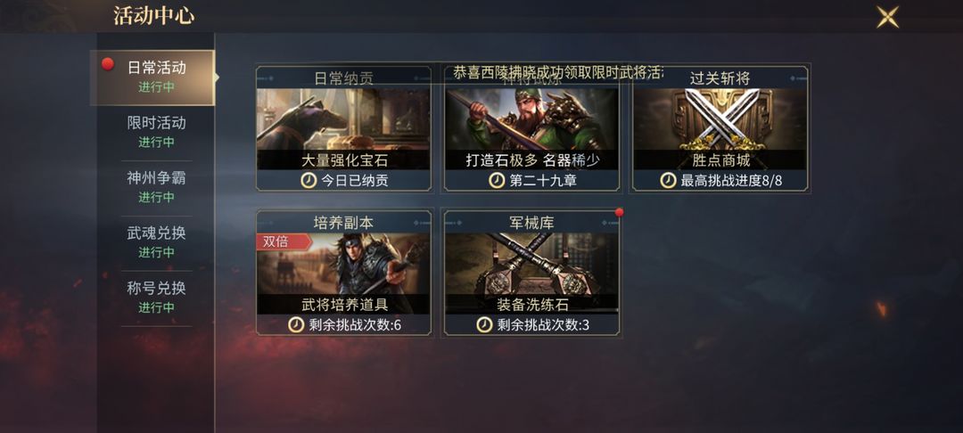 限时武将:吕布、武则天、项羽、陈宫、典韦、姜维、韩当、丁奉。喜欢的出什么搞什么,实用性高的,陈宫(要么三星,作为四赛季副将,可以无视出战类型限制,哪个城都可以打,要么满星可以刷城,打架)典韦(主要是战役,活动,竞技,打架,能打三赛季的南华)丁奉(要满星四赛季做副将)