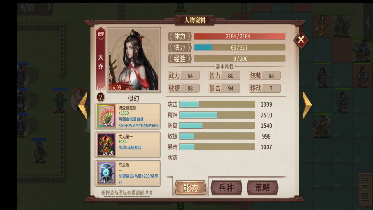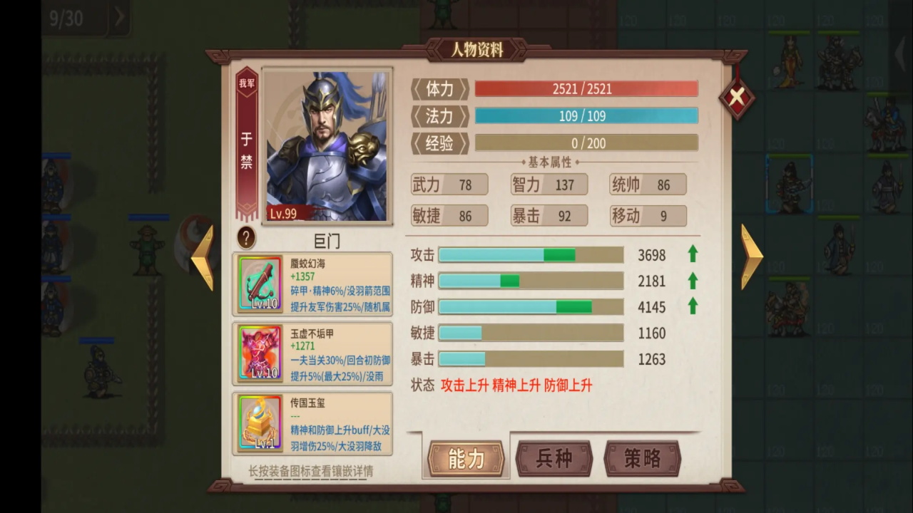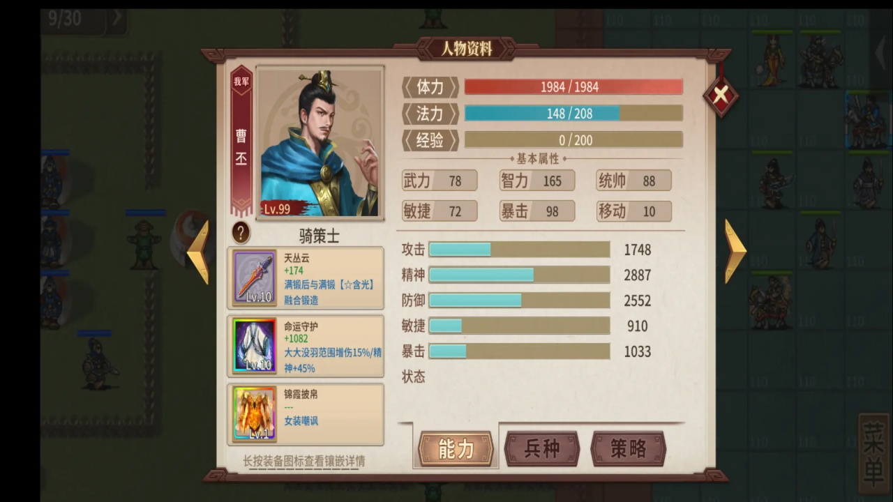 1.曹丕,骑策即可,装备不用和我一样。如果有女装的话,可以释放技能降低诸葛精神。