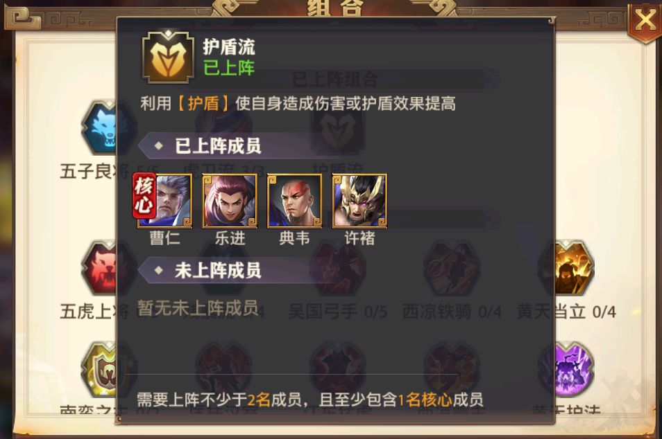 五子良将阵容中缺少前排,所以采用了虎卫流作为前排抵挡地方的攻击,虎卫流由曹仁、典韦和许褚组成,这三个人还和五子良将中的乐进形成了护盾流羁绊,增加自身护盾厚度或者利用护盾增加伤害。