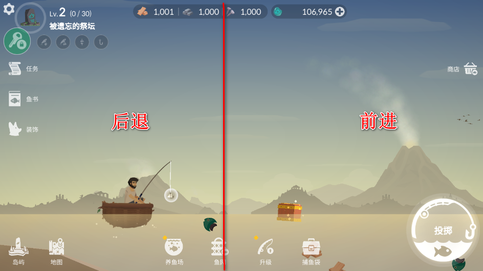 4.我们可以将屏幕分为两块来看,这两个区域可以移动船只,左半边是后退,右半边是前进。