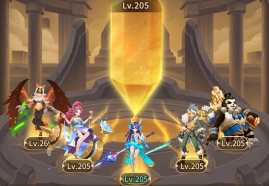 1.首先需要将共鸣晶碑的五个英雄都升级到340级。将下面的205的晶碑和英雄都升到340。