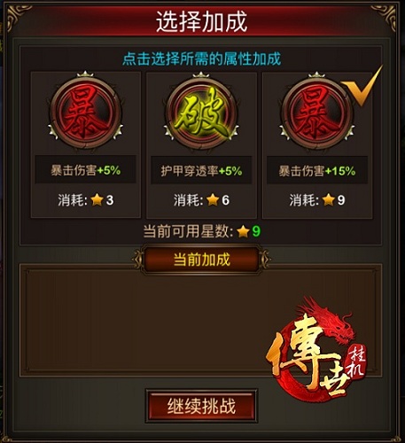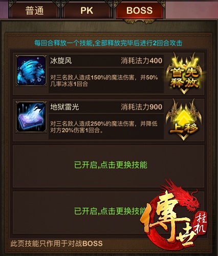 在通天塔不同关卡面前,技能搭配也极为讲究。进攻型关卡中,尤其是在15回合内击杀boss这样的通关条件下,需要主打输出型技能。而防守型关卡下,如果主体是战士则在第一回合就释放刺杀剑术,为元神增加护甲。主体是道士的话则使用幽灵护盾,增加元神闪避率。主体是法师的话,那就地狱雷光和冰旋风二选一,力求防守。