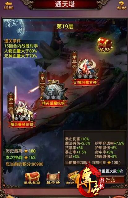 1.通天塔是《传世挂机》最为重磅的玩法之一,该玩法采用关卡模式,勇士通过破塔闯关来斩获无上荣耀,并收获海量珍贵奖励。随着21层-30层的开启,通天塔的闯关难度也再度增强,如何才能突破BOSS们的层层压制最终登顶云端呢?摸清过关条件是第一步。通天塔各大关卡间的通关条件各不相同,但30个关卡间,综合来分析,通关条件大概可以分为五大类,最为简单的莫过于在规定的回合数内击杀BOSS,再升一个难度则是在自身血量不低于规定值的情况下击杀BOSS。元神作为推塔过程中的强力辅助,也被列入了闯关条件中。在元神血量不低于规定值的情况下击杀BOSS也是一大类别,当然,难度再往上提提,就是自身和元神血量都不低于规定值的情况下击杀BOSS了。而带指定元神出战且元神不得死亡的特别通关条件算是刁难呢,还是送福利呢?这就看大家对元神的培养策略了。