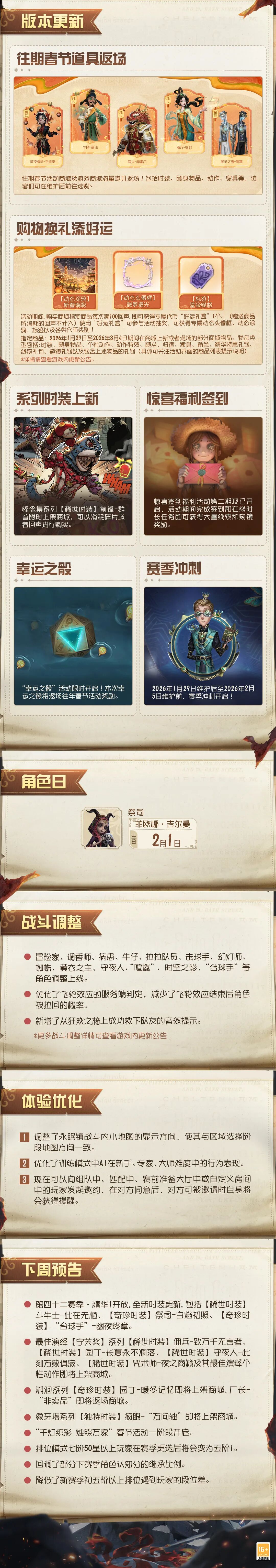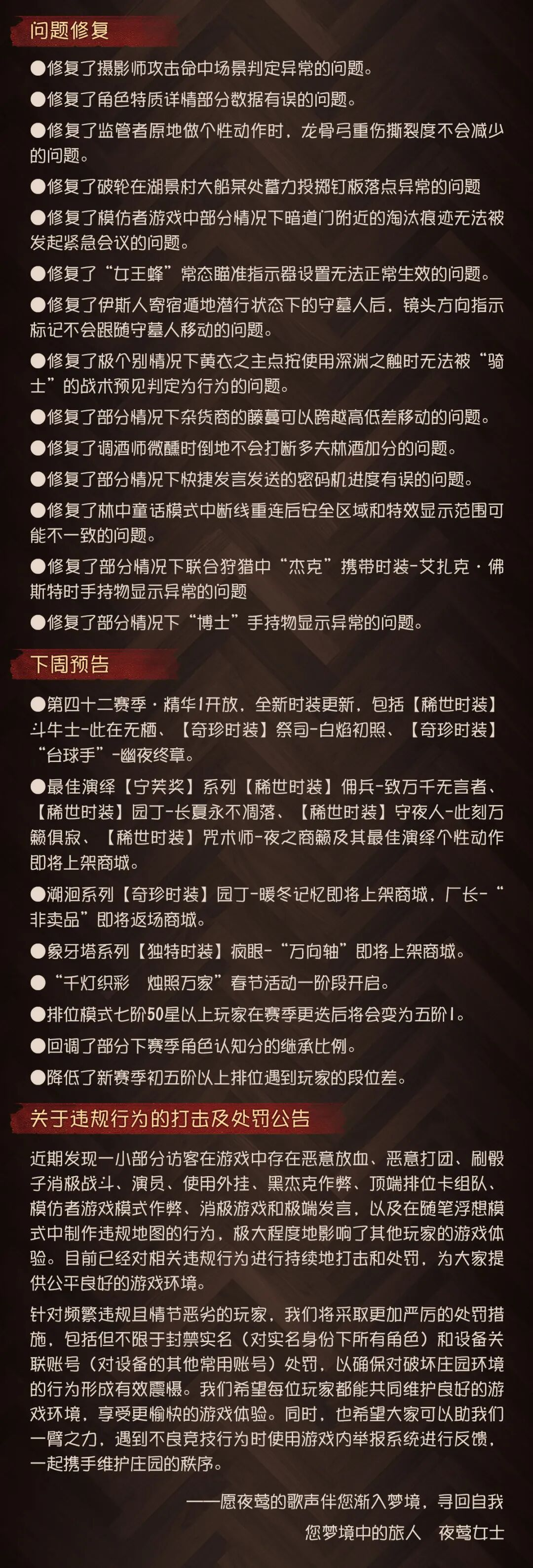 为保证庄园的稳定运行,【第五人格】将于周四上午07:30进行不停服维护。