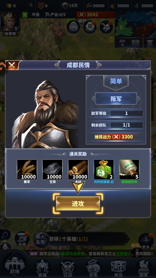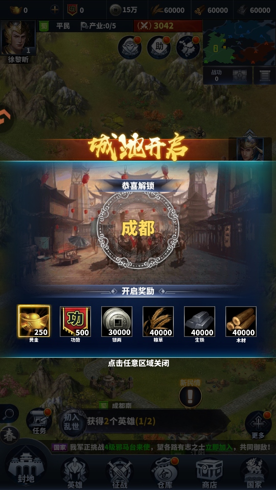 8.然后我们就可以解锁我们的第一个城池,开始我们的天下一统霸业的开始。