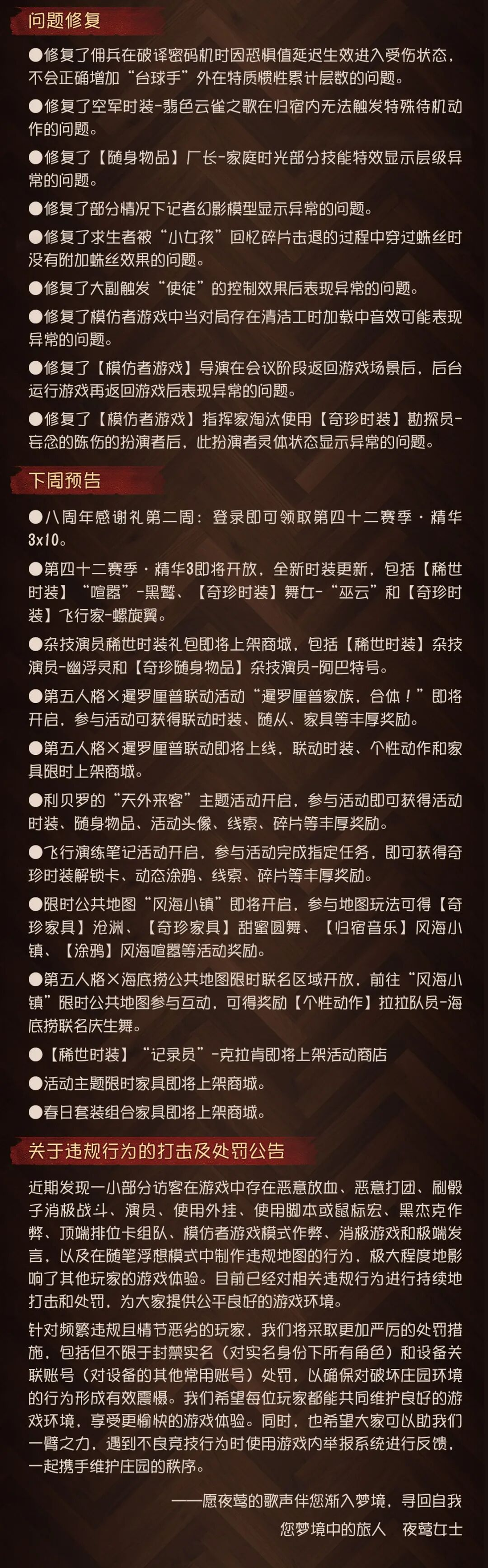 为保证庄园的稳定运行,【第五人格】将于周四上午07:30进行不停服维护。