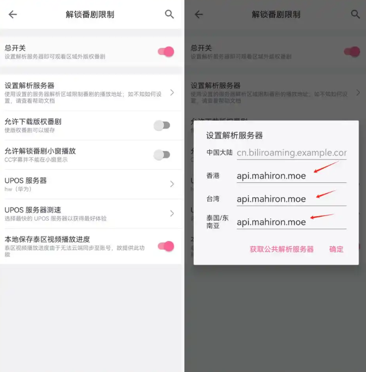 只需点击右下角的「我的」,然后选择「设置」,再找到并点击「解锁番剧」选项, 即可轻松开启插件,开始观看港澳台番剧。接下来,你需要点击「设置解析服务器」,并将网址“api.mahiron.moe”复制粘贴到相应位置。请注意,这个网址可以在获取公共服务器网址处获得。