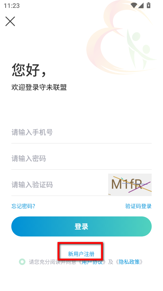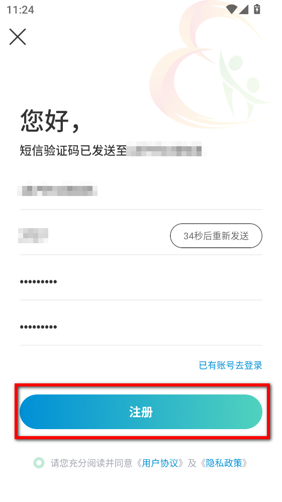 2.填写手机号,获取验证码,输入密码之后,点击注册。