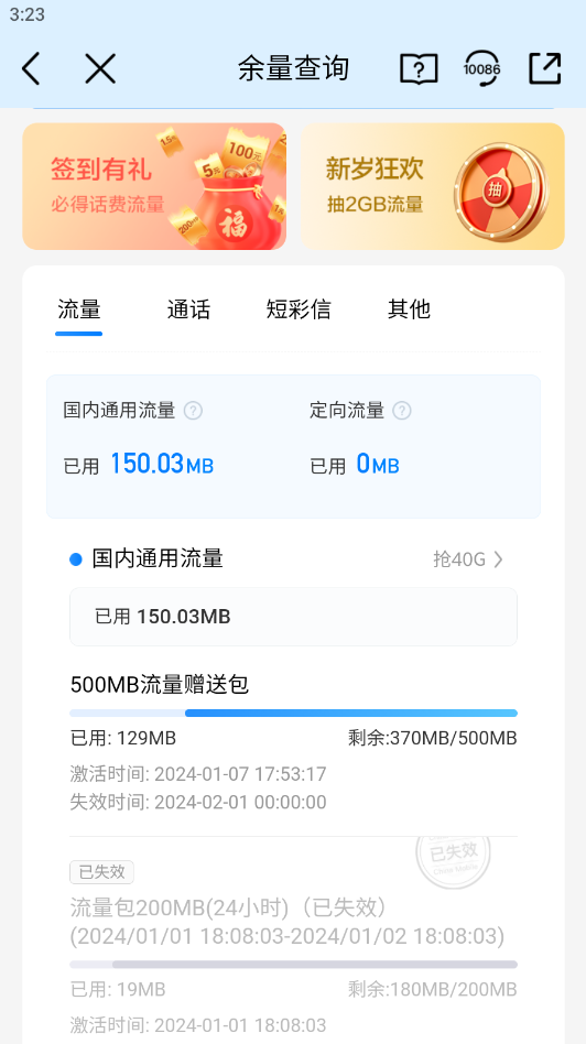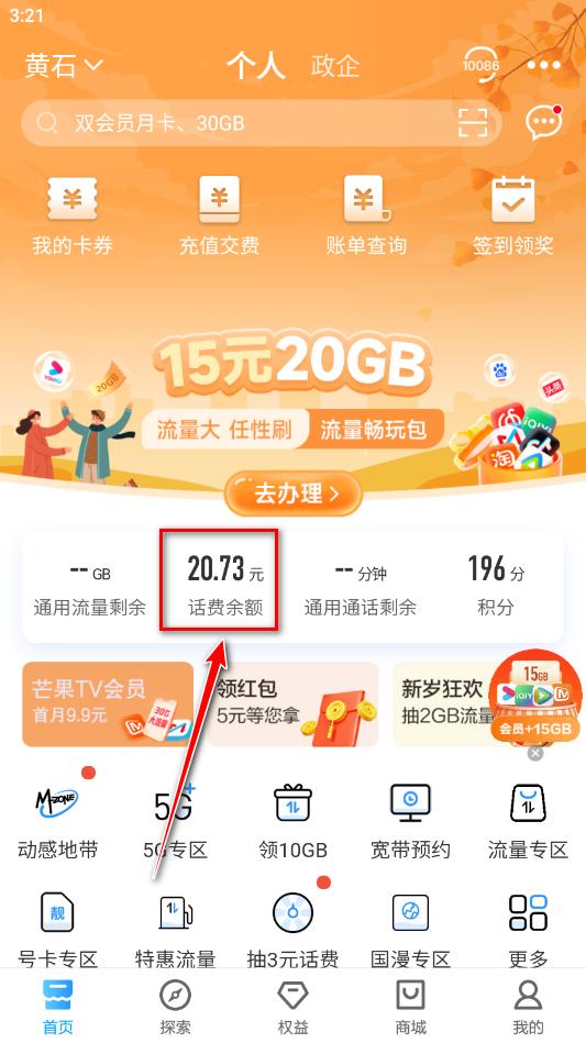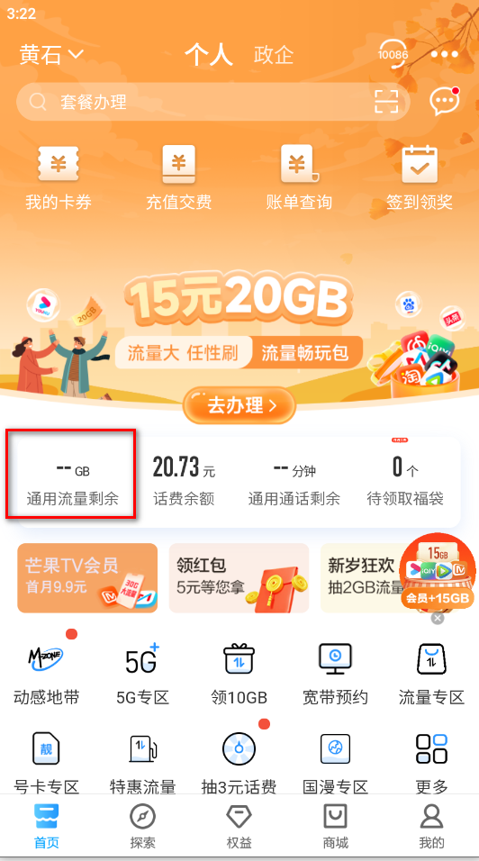 1.打开中国移动,首页就可以看到我们的流量剩余情况