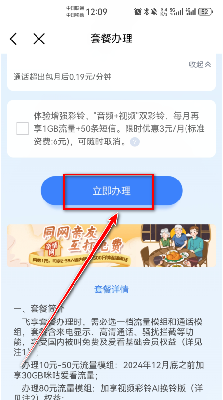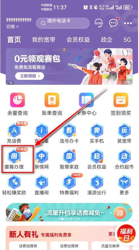 1.打开中国移动,点击套餐办理。