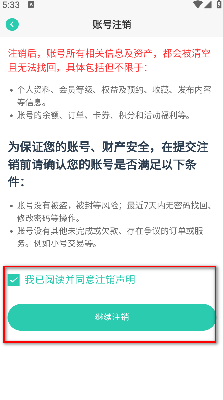 4.勾选我已阅读并同意注销声明,再点击继续注销。