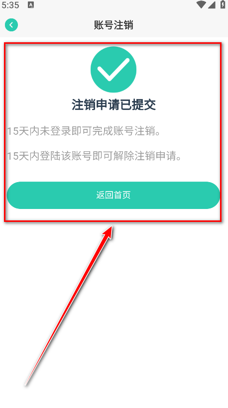 7.提示注销申请已提交即可,需要注意的是15天内未登录即可完成账号注销。15天内登陆该账号即可解除注销申请。