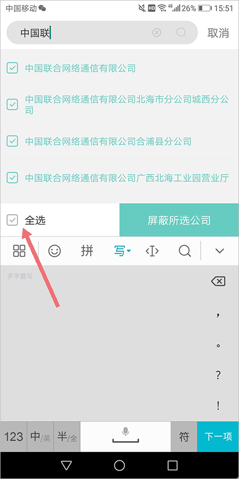3.在打开的搜索页面中,搜索你所要屏蔽的公司,然后根据下拉框中的公司名称进行依次按需屏蔽或勾选【全选】复选框(下图红色箭头所指区域)进行批量屏蔽。
