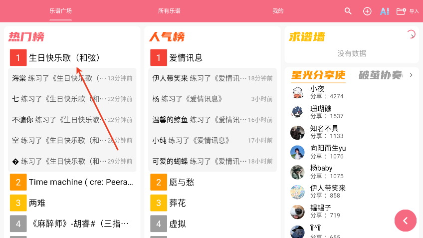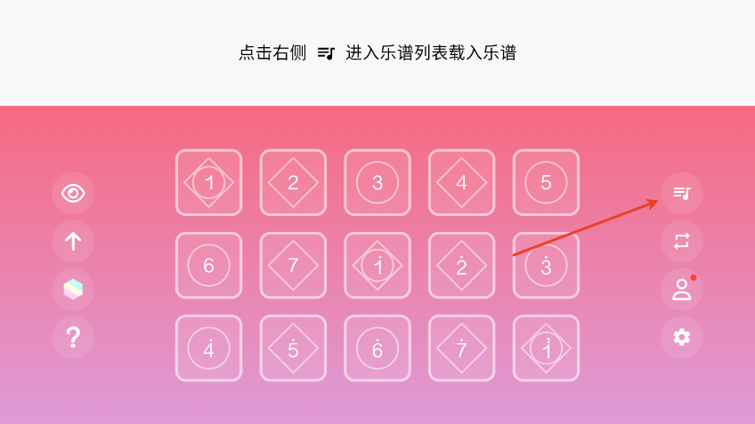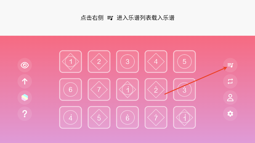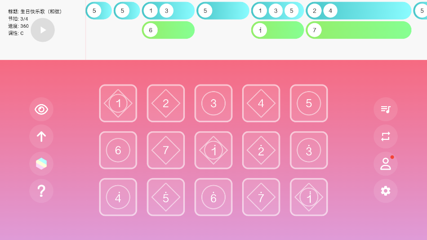 3、歌曲标题稍等片刻乐谱将加载到练习界面,乐谱分为三行,第一行对应键盘的第一行按钮