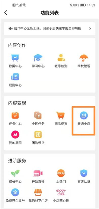 2、依次找到并点击“全部分类”、“开通小店”;
