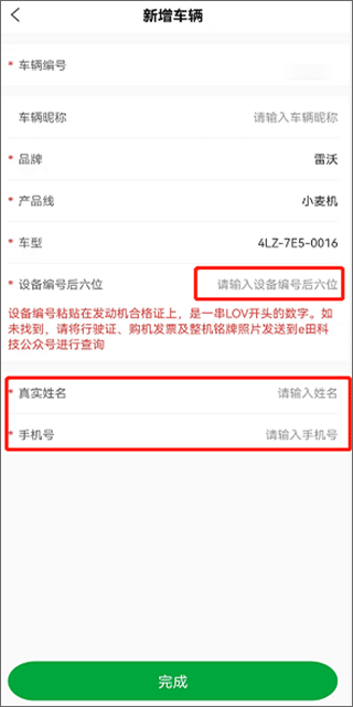 4.新增车辆页面,输入设备号后六位、姓名、手机号点完成即可完成绑车。