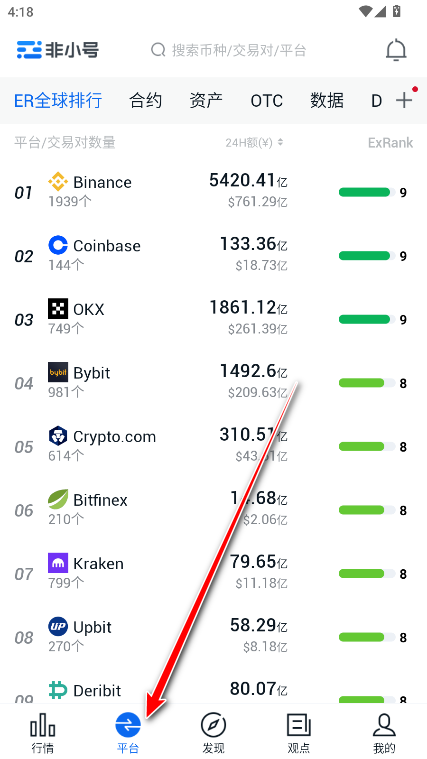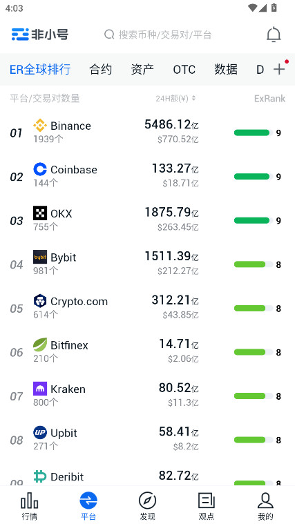 3.点击下方的平台,即可看到各个平台和平台的交易对数量信息。