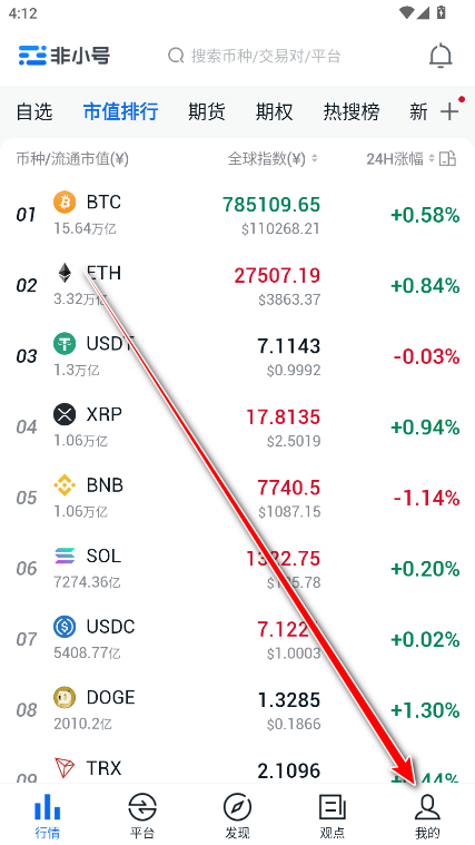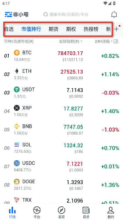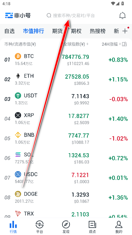 1.打开非小号,进入首页即可看到很多的板块内容,比如市值排行、热搜榜、期权等等。