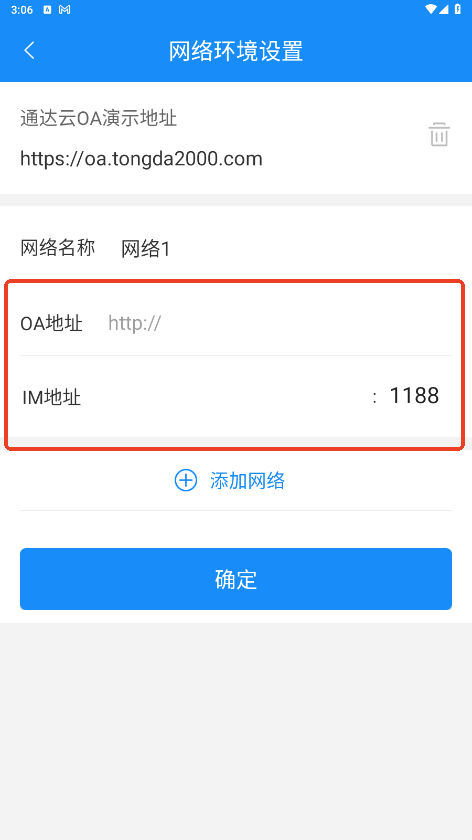 2.网络名称可任意设置,OA地址配置为:oa.jnmc.edu.cn或210.44.16.223(注意:OA地址和IM地址一致)