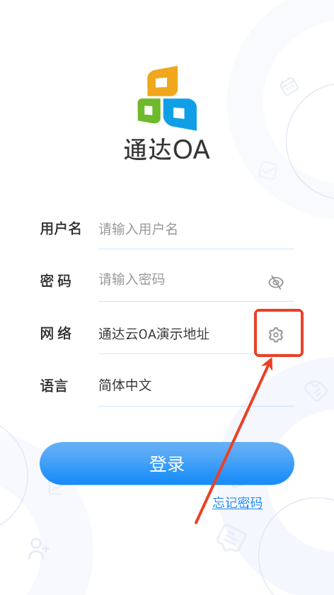 2、请在登录界面输入您的用户名和密码,点击OA地址栏右侧的齿轮形状按钮即可进入网络环境设置界面,设置您的网络地址如下图,设置完毕后退出;然后选择相应网络进行登陆。