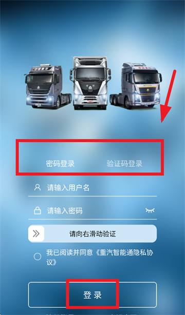 4.在登录界面可以选择密码登录和验证码登录,输入信息,勾选我已阅读并同意 《重汽智能通隐私协议》,点击登录即可