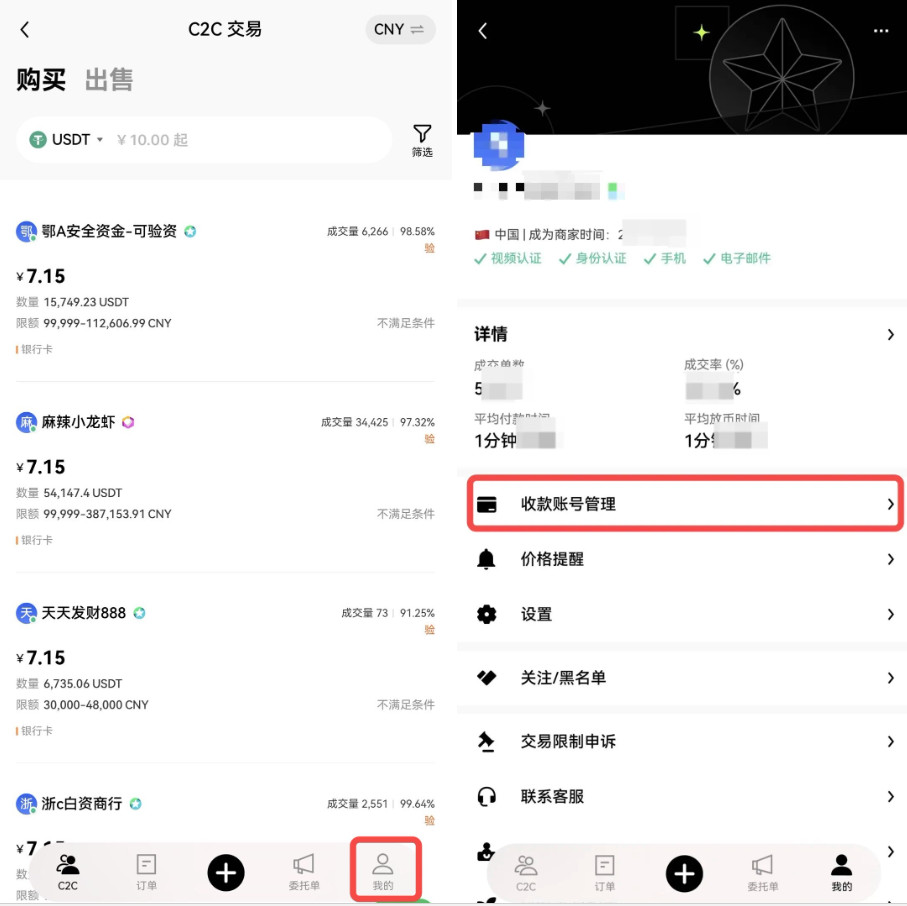点击右下角【我的】—【收款账号管理】;