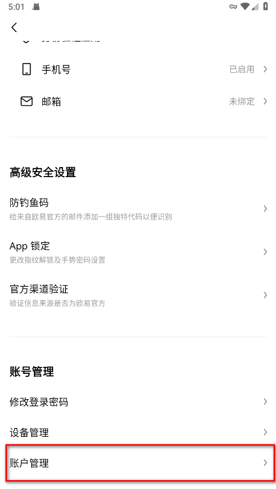 滑动到最底部,点击账户管理