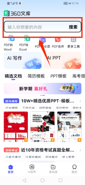 2、于首页搜索栏输入关键词,即可查找所需的文档资料内容。