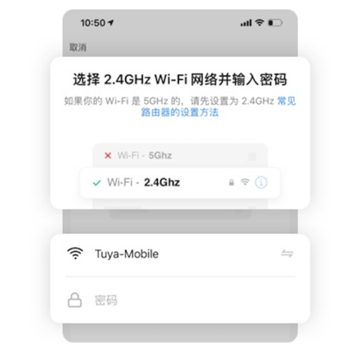 选择家中2.4GHz的Wi-Fi频段,并输入网络名称及密码,让设备连接网络。