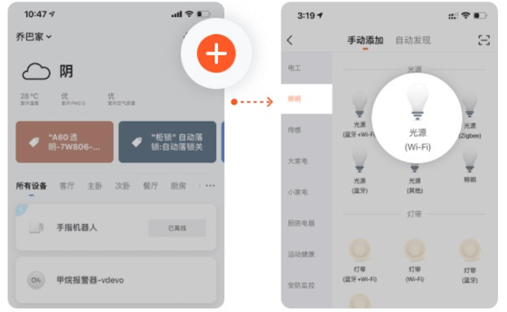 照明设备可反复开关3次。其他设备可长按复位键5秒。指示灯闪烁表示设备已进入配网模式。