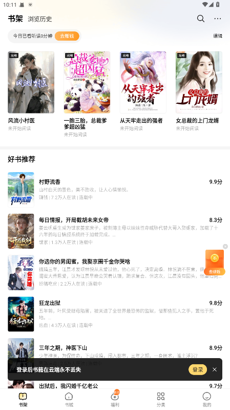 3、获得金币的方式有很多,用户可以在福利页面往下滑,看到很多金币获得方式,如阅读、完善信息、打开消息通知等等。