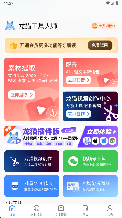 龙猫工具大师app是您素材创作的超级工厂,更是您运营提速的高效引擎;它集成了三十多种实用的专业功能,满足您处理素材的全部需求;它能对视频进行裁剪、格式转换和高清压缩,让您的视觉作品完美呈现;它能对音频进行提取、变速处理和降噪优化,让您的听觉内容清晰悦耳;它能对图片进行批量水印、尺寸修改和智能拼图,让您的平面设计快速完成;它能对文案进行智能排版、敏感词检测和语句润色,让您的文字表达精准有力;它不仅能大大节省您寻找工具的时间,更能全面提升您素材处理的效率。