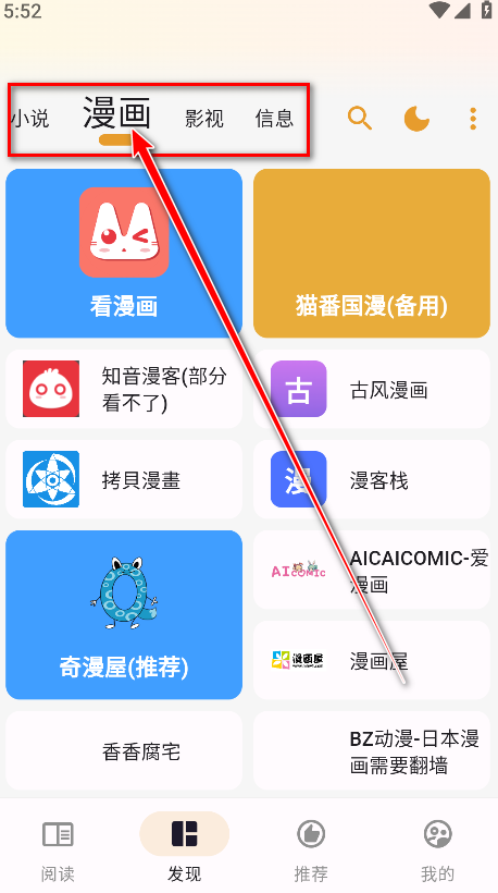 3.可以看到这里有着小说、漫画、影视等板块内容,在这里小编以点击漫画为例。下方就会有很多的漫画源。