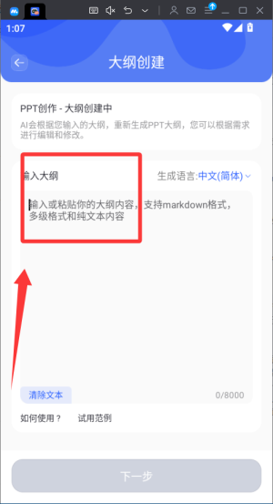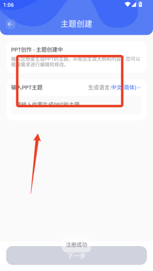 2.使用智能生成功能输入核心主题词,系统自动生成大纲框架与分页内容,支持实时调整章节顺序与标题层级。