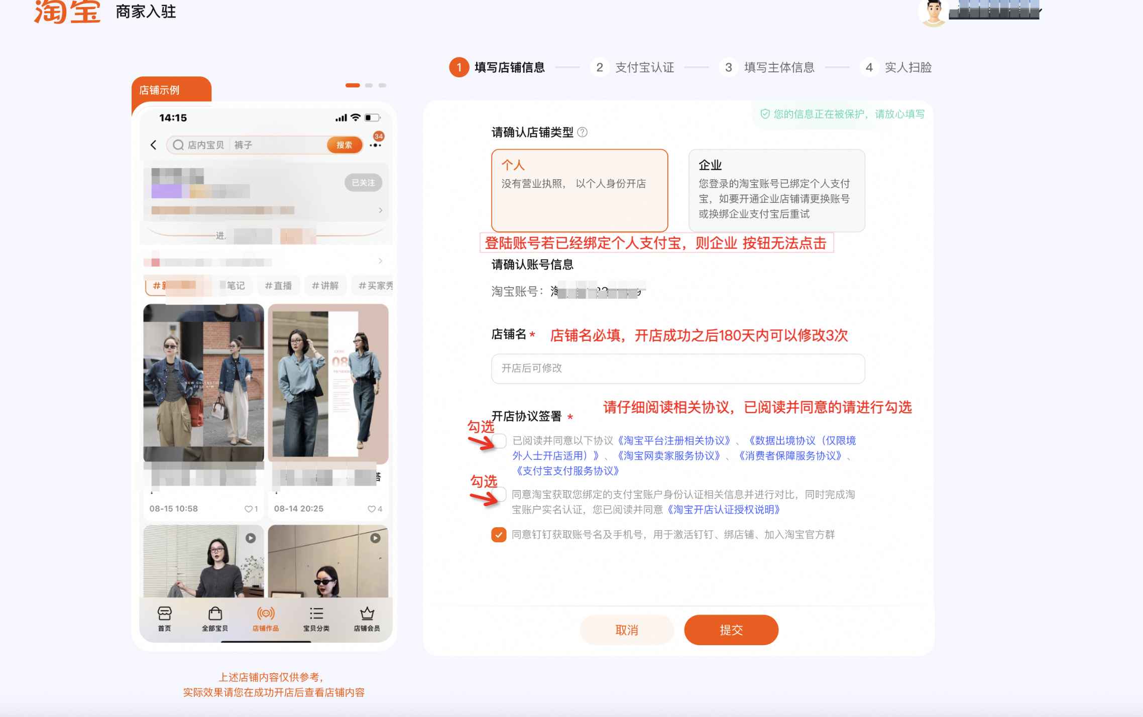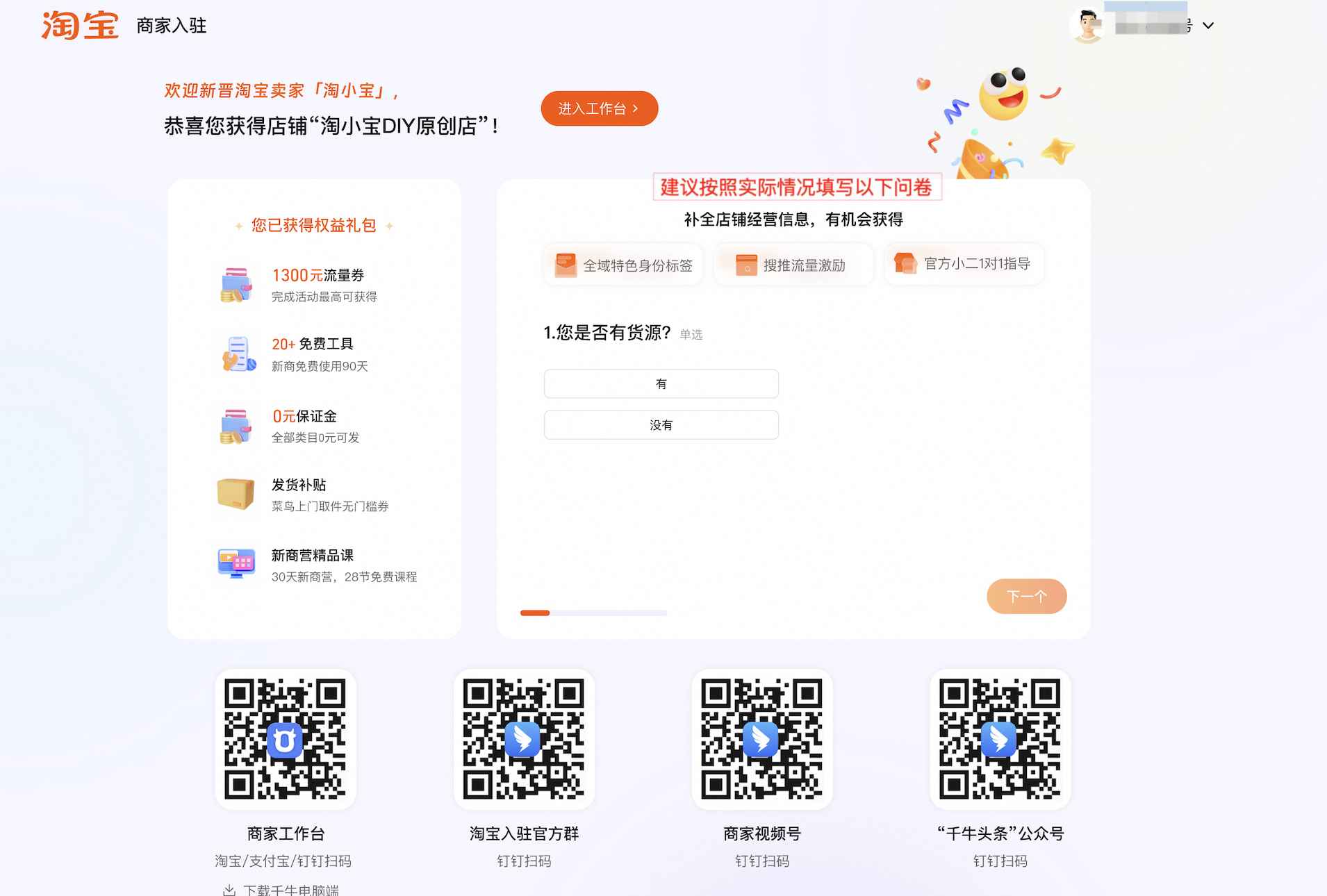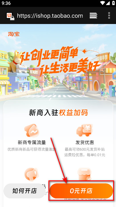 1.进入淘宝开店页面https://ishop.taobao.com/,或者手机淘宝内搜索“开店”并点击0元开店