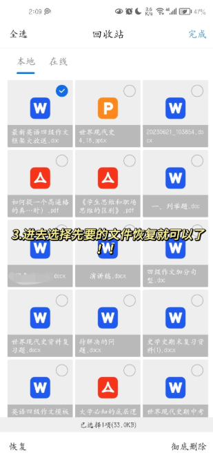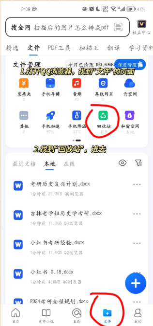 2.接下来,在“文件”页面里,你会看到一个“回收站”的选项,点击进去。在回收站里找到你误删的文件,选择恢复就好了。