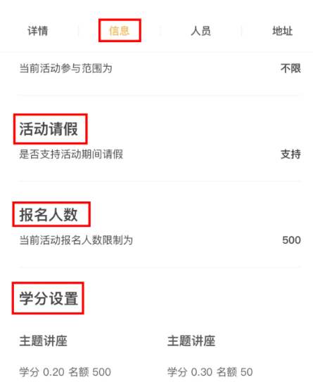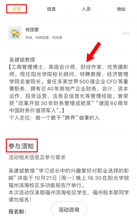 4、报名情况(已报名人数和限额)、活动联系人(活动负责人和组织者的信息及手机号)、活动部落(活动主办方部落)、活动详情。