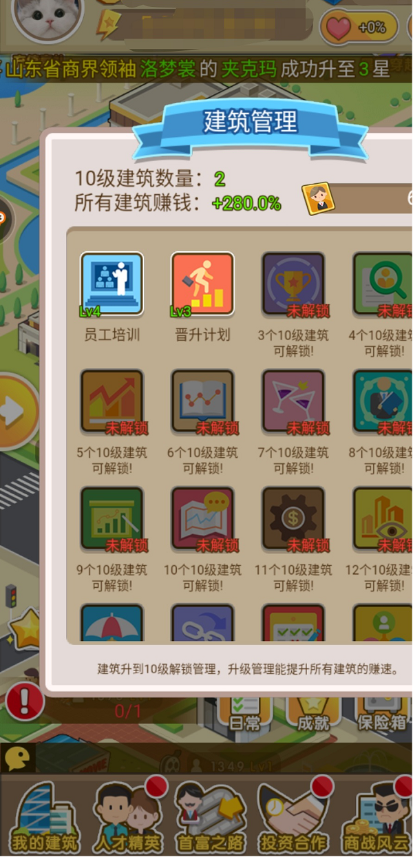 我先从建筑来为大家介绍一下,我们可以看到下面有一串的就是关于建筑赚速来源啥的解释。这里我就不过多于去介绍了。假如我们作为一个刚玩的人,刚进入游戏,不要把我们的建筑卡胡乱花(当然你是土豪的话这个就另当别论),我们需要把建筑卡集中升一个建筑,这样既是为了我们迅速提升赚速,另一个更是为了下面的管理系统的开启(这个无论对于平民玩家还是土豪玩家这也是一个很重要的赚速来源。