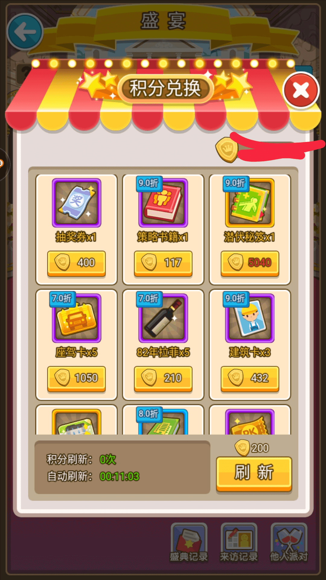 而且星际币能兑换很多东西。比如建筑卡等等,这又是建筑卡的一大来源。下面我们该聊聊宴会派对了。前面我也说了家族战获得的金币就多兑换礼包这个是没有错的。因为当有人开豪华派对的时候,就可以送上了,一个礼包有1500多积分。而假如没有礼包的话在豪华派对上送上随礼也会比小型派对得到的多。所以到了宴会冲榜的时候我们应该要往豪华派对多走走。得来的积分也挺好的,可以换建设卡,这个是除了充钱以及抽奖获得建设卡的唯一途径(这是我发现的,不知道还有其他途径不。)当我们遇上打折的时候就换建设卡吧要不挺亏的,建筑卡和座驾卡打折也可以多换。其实打都可以换。那些个秘笈呢就看自己心情,最重要的还是卡嘛。