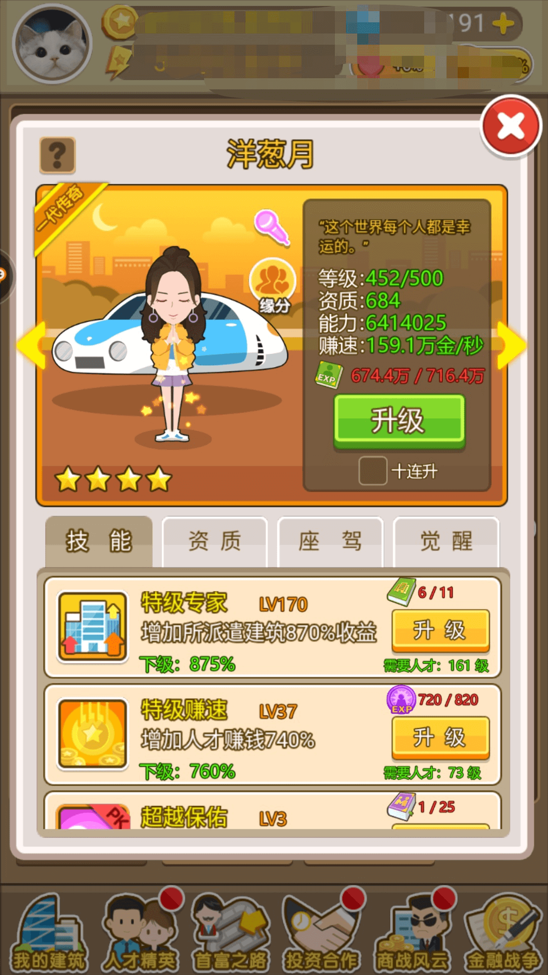 下面我要给家介绍的是人才,人才主要在建筑派遣以及金融战争商战争霸试炼派遣一系列活动中用到。而很多玩家在怎么使用人才卡换取角色的时候其实是不正确的。我们应该根据自己的明星缘分来换取,这样才能最大利益华。比如阿祖和哎哟伦和洋葱月他们之间是有缘分的这样养好处在于我们商战争霸等等有增幅。更多的缘分请大家自己点击人物那查看。而人物的能力最主要来源于资质增长等级增长和座驾所给的加成甚至于包括觉醒(这一项属于土豪玩家才能开启的),平民呢就老老时时的每天去往家族馆进修获得对应的道具,以及人物进修那会给相对应的碎片可以合成。推荐养人物这样养一个主要的升到500级队伍内其他的就到200级。六个人这样一队人养,因为商战争霸活动是六个人打的。(六个人还是那句话注意缘分搭配)。