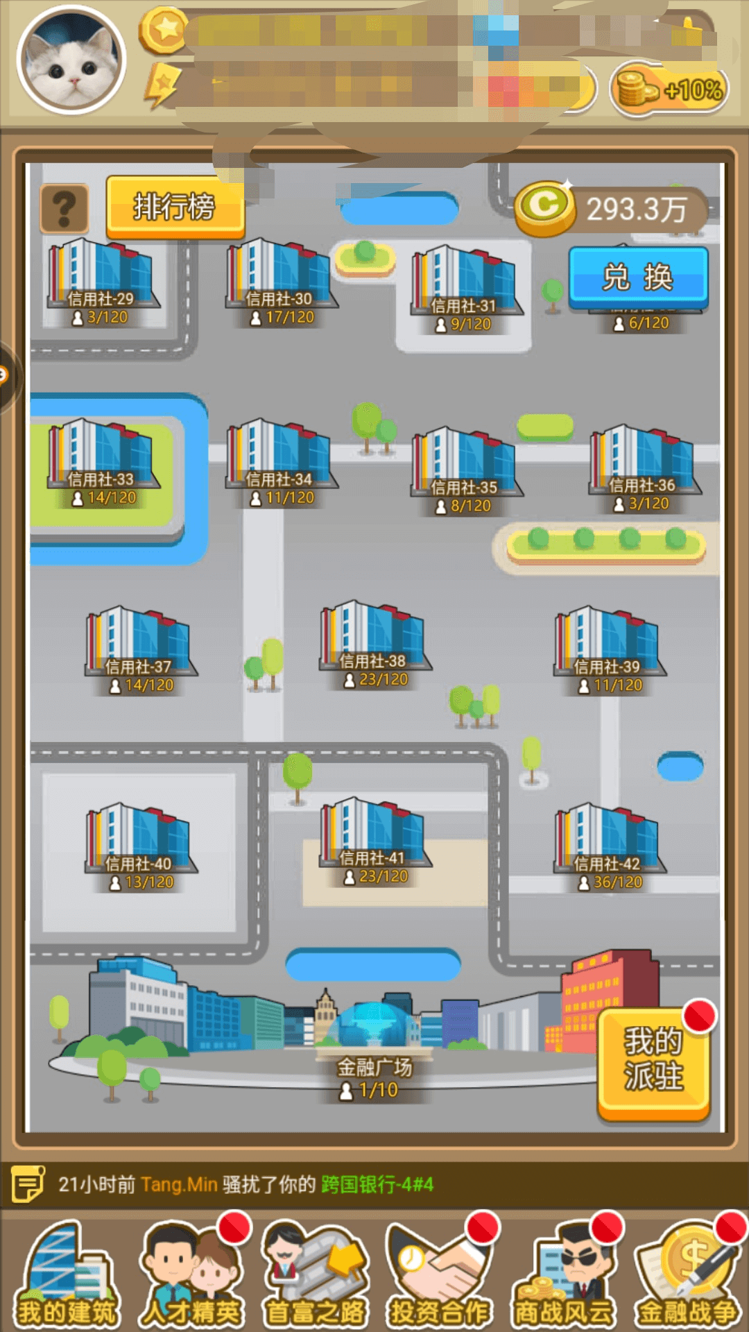聊完了家族,我们现在来聊下金融战争。金融战争这个是游戏一大特色,占领了就可以获得金融币。金融币的话我们每天必换的是投资卡,管理卡。像那些奥斯卡奖和赚钱卡呢其实可要可不要,尤其奥斯卡对于前期的玩家来说或者不是特别土豪的玩家来说其实都是花不完的。金融战争呢我推荐的玩法是分开占领。把自己最厉害的人物带几个第二次的人物去占一座,然后中等的人物再占领一个,最后还剩下的再去占一个位置。当然你有更多的人物也可以再占。提供一个思路。 很多人都没有注意到当我们往下拉的时候,会有一个金融广场,这个地方呢,可以说是挺福利的,要是你的等级够高他给的提成也高。自然不用去占领其他地方。所以大家别忘记了这还有那个地方。