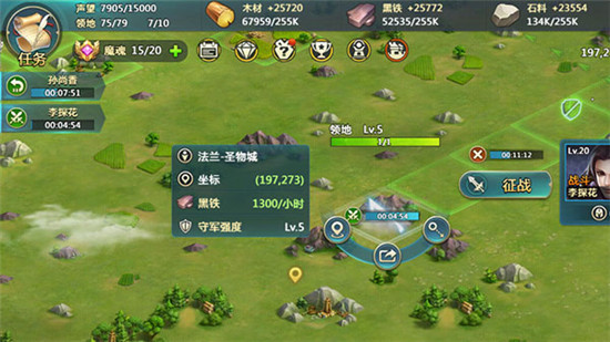 (7)前期是扩大征地、增大资源产量的关键时期,最好把主力军阵的体力都用在征战领地上,用空闲的第二军阵或者第三军阵来采集资源。