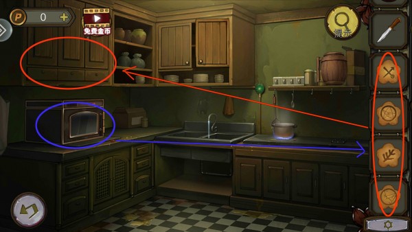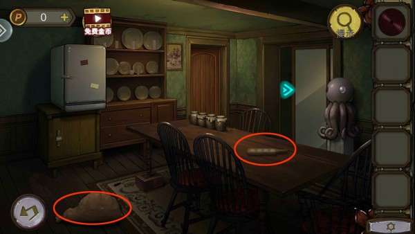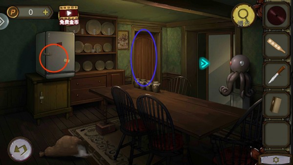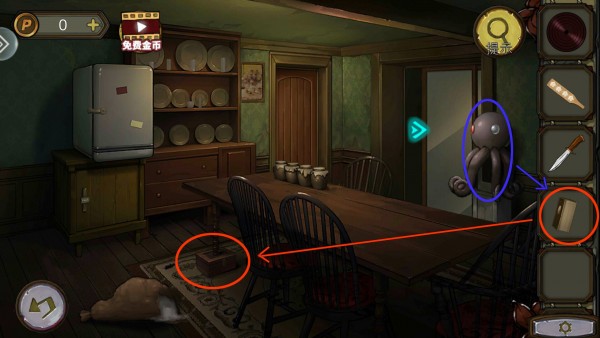8、玩家用三角形木块打开餐厅的冰箱,然后可以拿到钥匙,使用钥匙打开地下室门。