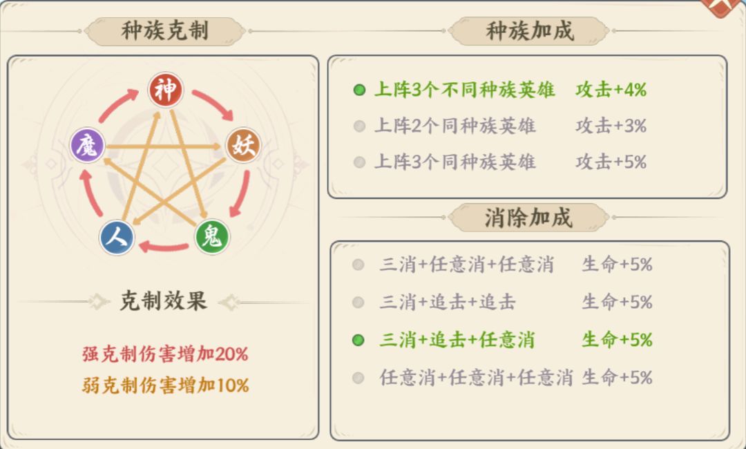 在战斗中、阵容调整和英雄详情等界面中,我们可以看到英雄有不同的消除类型。