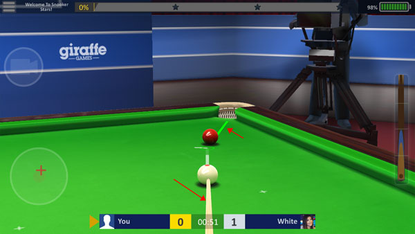 3、确认好台球能够打进洞后,点击右边的球杆开始蓄力,不同的力度同样决定了台球是否会打进洞。